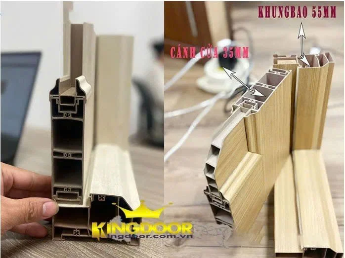 - Cánh cửa chắc chắn: Làm từ PVC hoặc uPVC ép đúc nguyên khối, phủ film vân gỗ hoặc sơn màu, bề mặt nhẵn, chống trầy, dễ vệ sinh và không cần sơn lại.